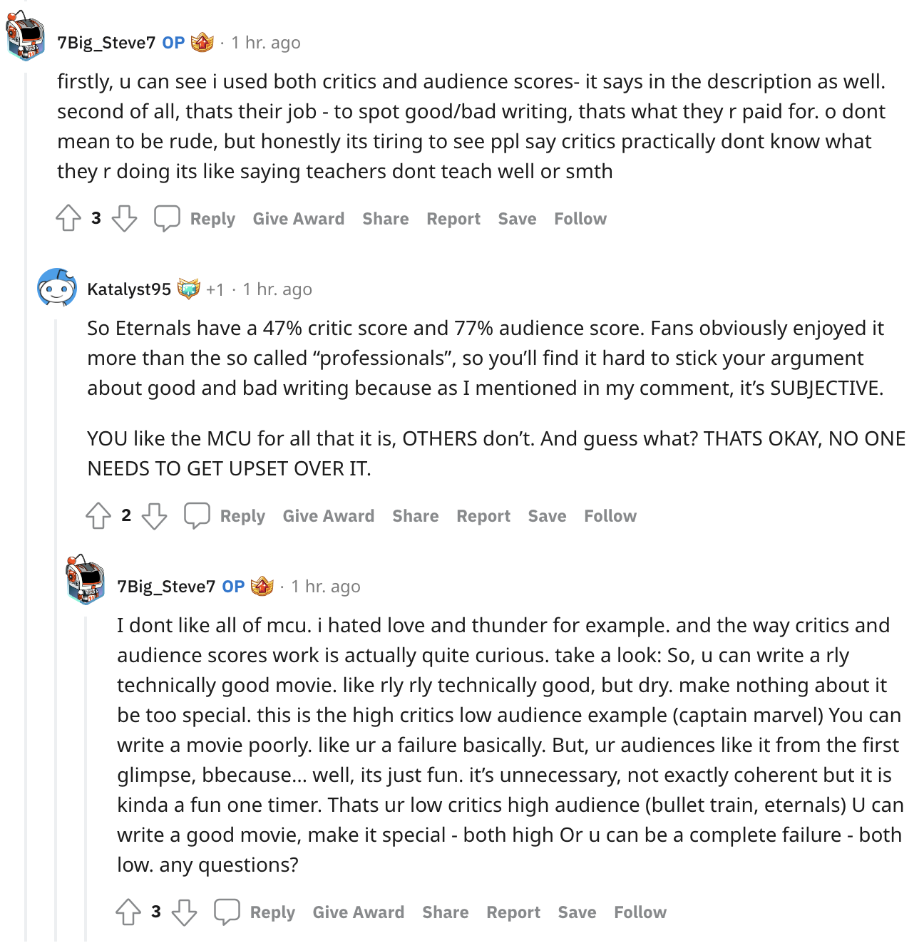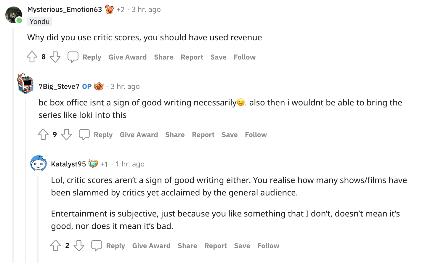 While some fans were very impressed with OP, others wondered why they didn’t use box office numbers. OP argued that if they used box office data, they wouldn’t be able to include Disney Plus’ series such as Loki. They also argued that box office numbers do not equal good writing, but fans said the same can be said for Rotten Tomatoes rankings.