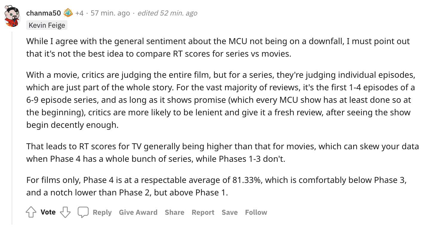 Meanwhile, others told OP that Rotten Tomatoes is not a good source when comparing movies and TV shows as it could skew the data. They also pointed out that Rotten Tomatoes only takes the average review data and they should have looked elsewhere. This led to one Reddit user recalculating the results by removing the Disney Plus series, which in turn puts Phase Four under Phase Two and Three.