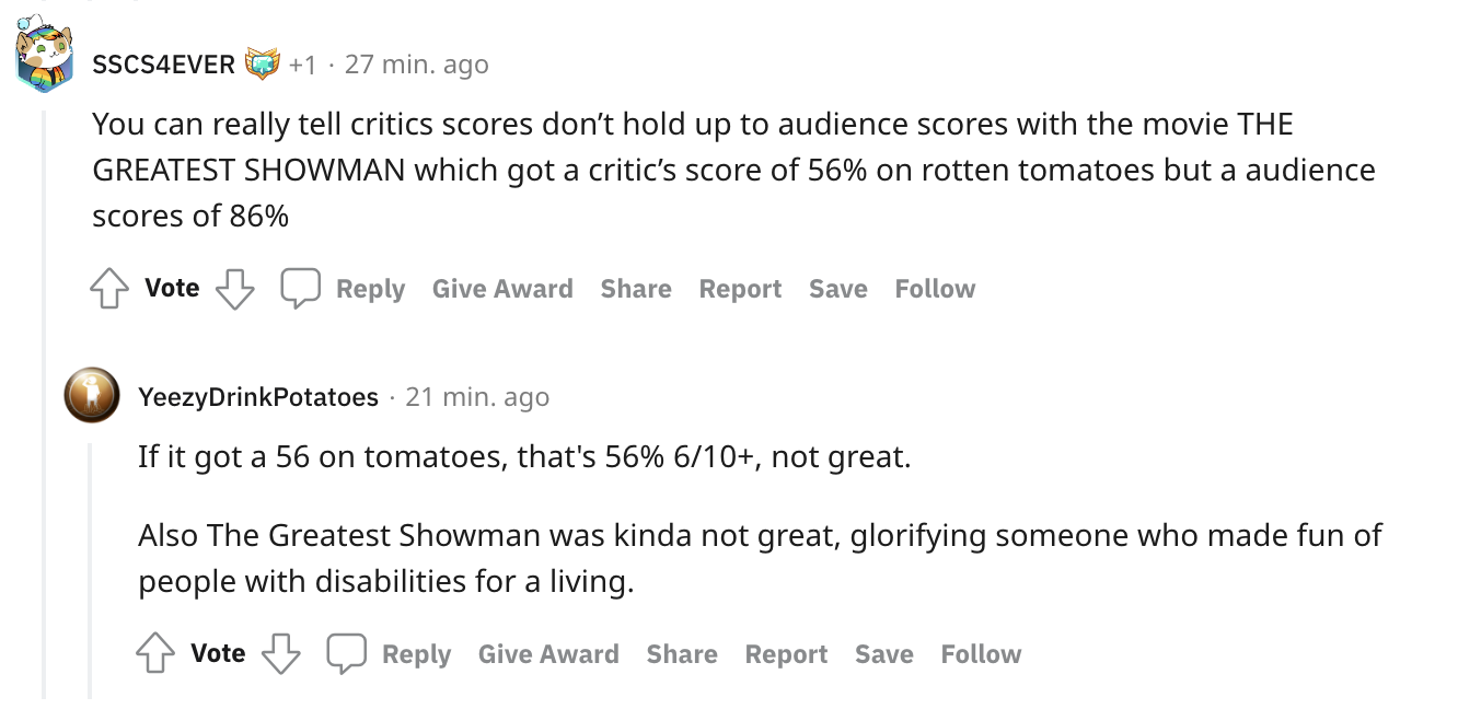 Fans reminded OP that people’s views on films and TV shows are subjective and it shouldn’t be taken lightly, especially if they’re basing their results on Rotten Tomatoes. In the end, it’s what people enjoy, and critics’ thoughts are different from the audiences’ tastes.
