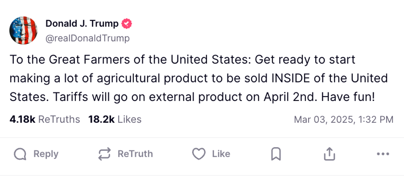 Trump has told farmers to “get ready to start making a lot of agricultural product to be sold INSIDE of the United States” and promised tariffs on “external products” beginning April 2: