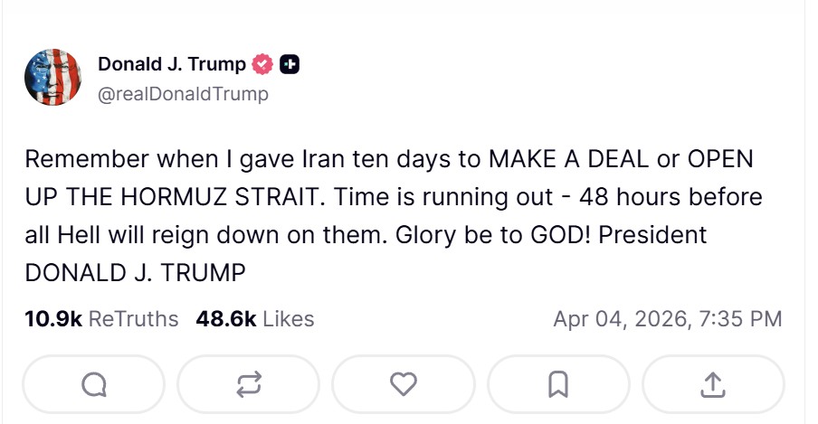 He opened with a threat, “Tuesday will be Power Plant Day, and Bridge Day, all wrapped up in one,” then emphatically stated, “Open the F—in’ Strait, you crazy b——s, or you’ll be living in Hell – JUST WATCH!” However, it followed a post from the previous day, April 4th, that reminded everyone of a previous ten-day ultimatum he had given, “Time is running out – 48 hours before all Hell will reign down on them. Glory be to GOD! President DONALD J. TRUMP.”