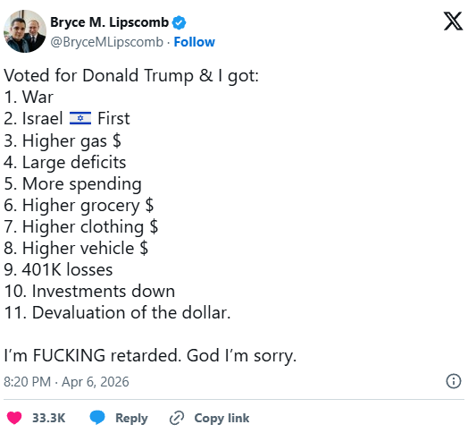 Each day more and more Americans realize they screwed up big time, whether that be your jaw dropping when you see the cost of filling up your tank, getting your deployment orders to fight in Iran, finding you no longer have healthcare, or – heck – just turning on the news to see the visibly unhinged president telling the nation “Praise be to Allah!” on Easter Sunday.