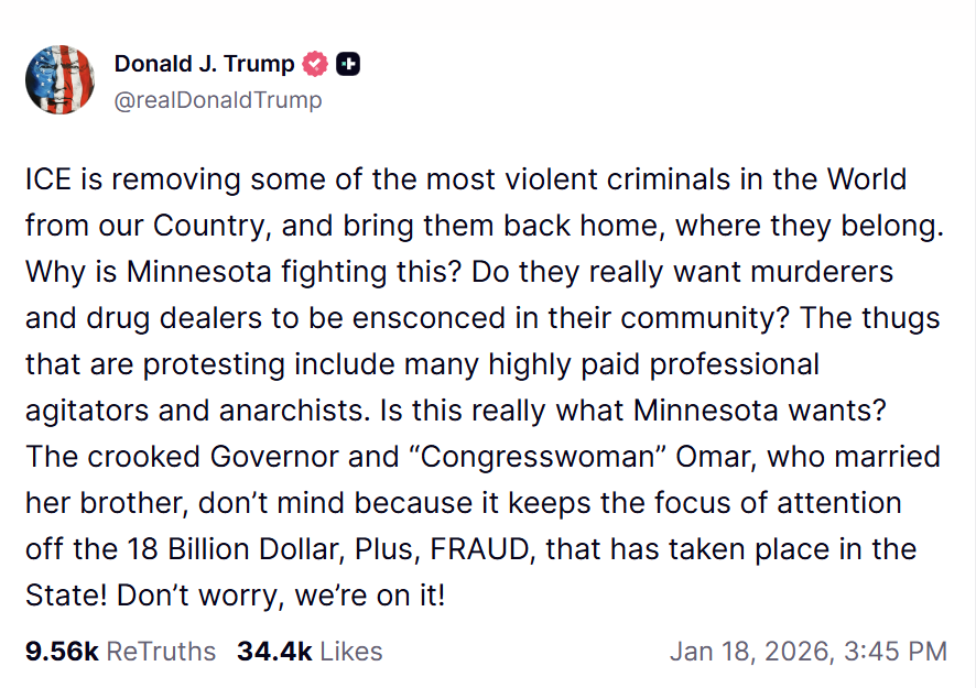 “ICE is removing some of the most violent criminals in the world from our country, and bring [sic] them back home, where they belong,” he wrote. “Why is Minnesota fighting this? […] The thugs that are protesting include many highly paid professional agitators and anarchists. Is this really what Minnesota wants?”