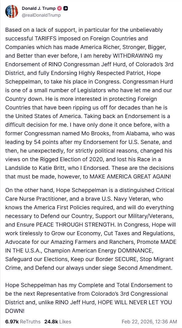 The target of his latest political arson? Colorado Rep. Jeff Hurd, a first-term Republican who had the audacity to vote with five fellow House Republicans and a unanimous Democratic caucus to repeal Trump’s tariffs on Canada earlier this month. The sheer nerve on this guy!