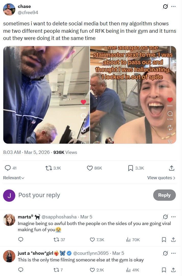 Redditor r/newphonehudus called it a “mythological algorithm pull,” which is just perfect. The comments took off, with folks imagining what they’d do if RFK Jr. took the machine next to them. “I would have asked why his stupid a— was wearing jeans,” r/LeopardNo6083 claimed, calling it a “wasted opportunity.” Another Redditor, r/auntiefuh25, simply wrote, “I would get kicked out of the gym at the very least.”